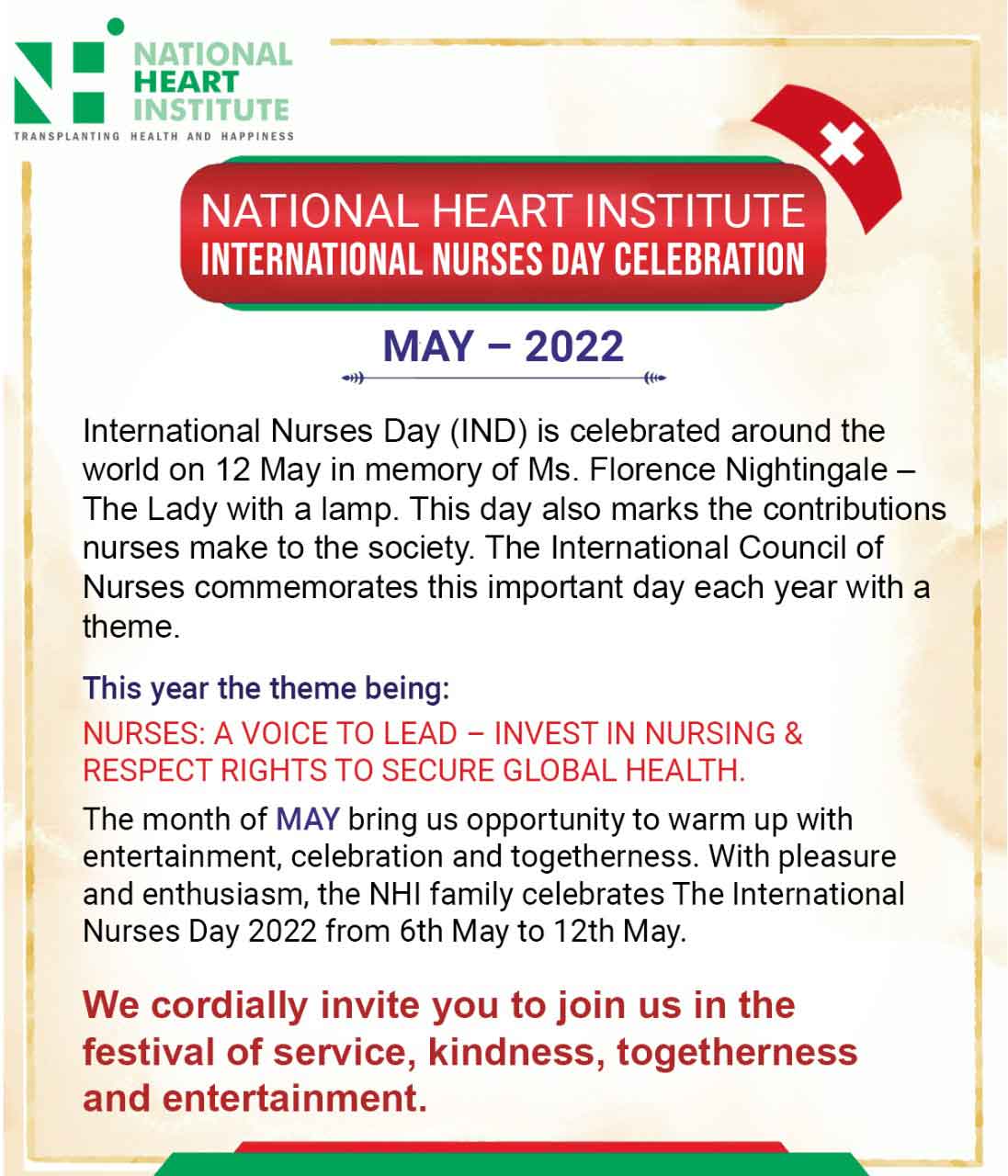 International Nurses Day (IND) is celebrated around the world on 12 May in memory of Ms. Florence Nightingale – The Lady with a lamp. This day also marks the contributions nurses m...